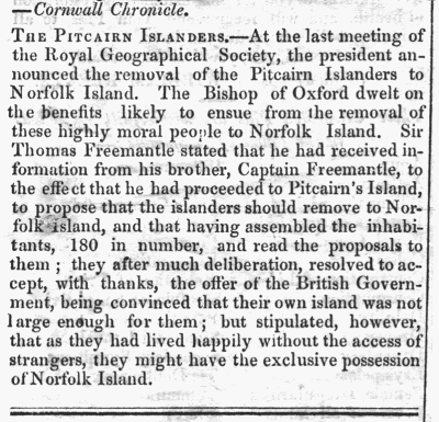 the Pitcairn Island to the Norfolk Island in 1856.
