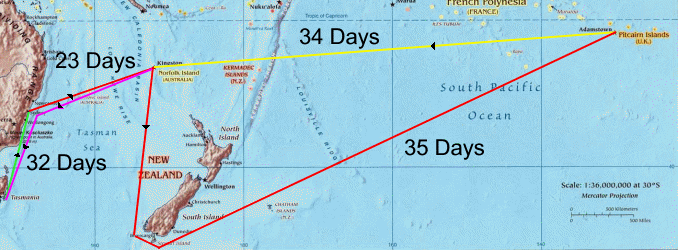 She then took 35 days to sail the 5500 miles around the south of New Zeland to Pitcairn Island @160 m/day.